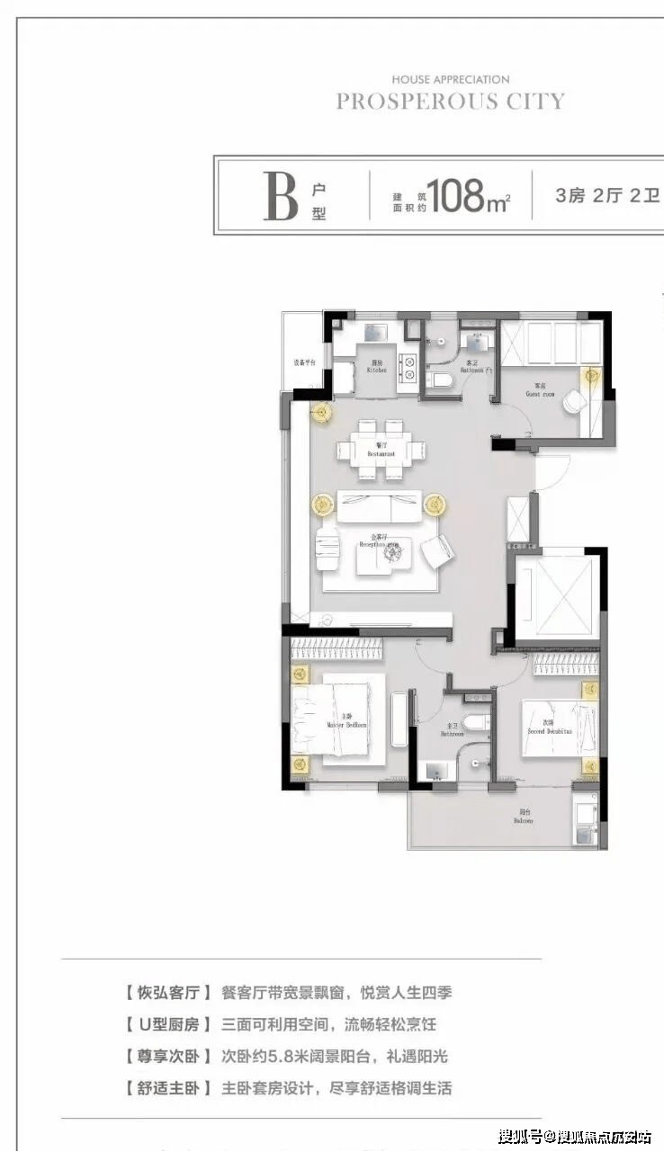 建面约108㎡户型就略带一些改善的意味了。高端项目常见的大边厅,营造了客厅、餐厅、厨房开放打通的“LDK一体化”模式,使空间感更加通透。U形厨房让动线更加流畅顺滑,尺度感甚至可以和市场上一些改善产品不相上下。