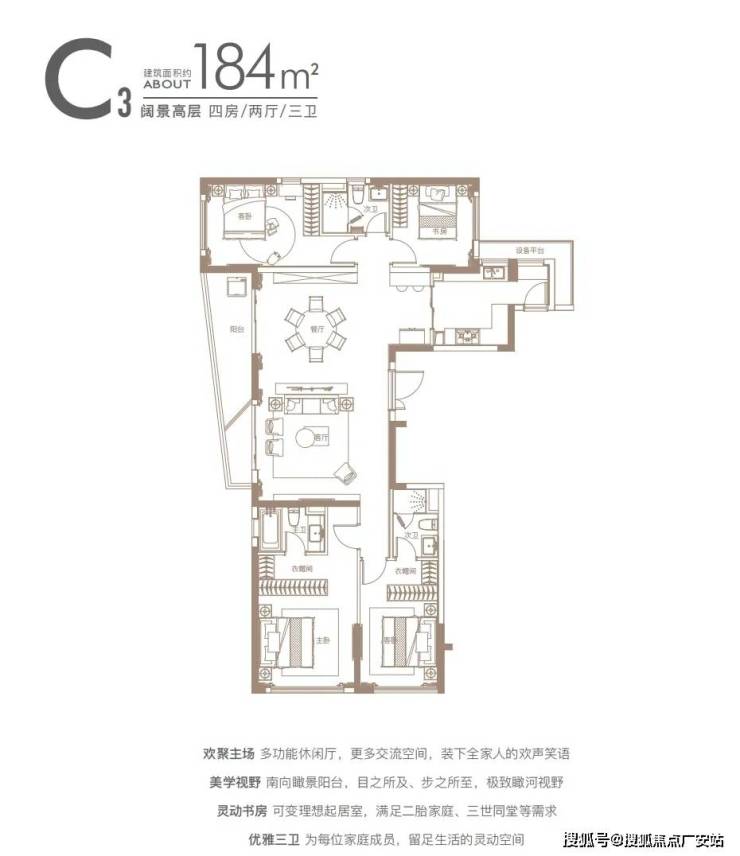 一期3#地块:规划有一幢18层高层和两幢6层多层,容积率2.33,产品包括建筑面积约108㎡3房2厅2卫,约136㎡4房2厅2卫。