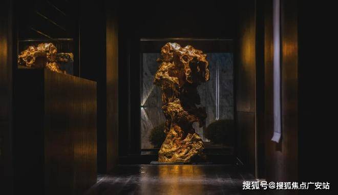 那相对应,设计师充分融入了在地文化。比如,重造“露香新园”,以现代手法再现当代露香八景,并在前厅空间放置了一座高达2.25m的艺术雕塑,呼应堂前“露香池”园林叠石假山的奇趣。