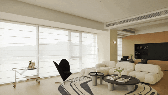 中央的B&BCamaleonda模块组合沙发,以岛状布局重构空间逻辑,双向陈设的低椅背设计。一面朝向书柜电视墙,一面衔接餐厨区。让场景切换随心意而生,既保持空间通透感,又以功能分区提升使用效率。