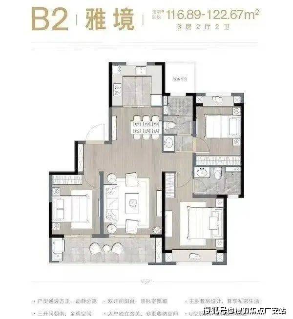 122-136㎡三居/四居:U型厨房、主卧套间设计,部分含双开间大阳台