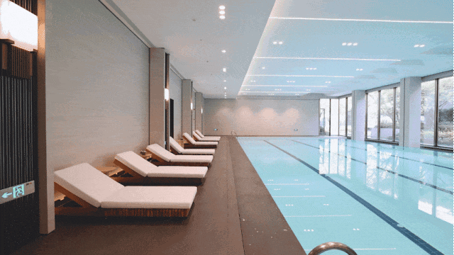 在下沉式景观庭院两侧,是不同的邻里空间。一侧是社区邻里中心,涵盖恒温泳池以及宽阔的健身房空间。当业主锻炼时,不被空间局限。透过落地窗,可以一边挥洒汗水,一边尽情欣赏庭院中的美景。