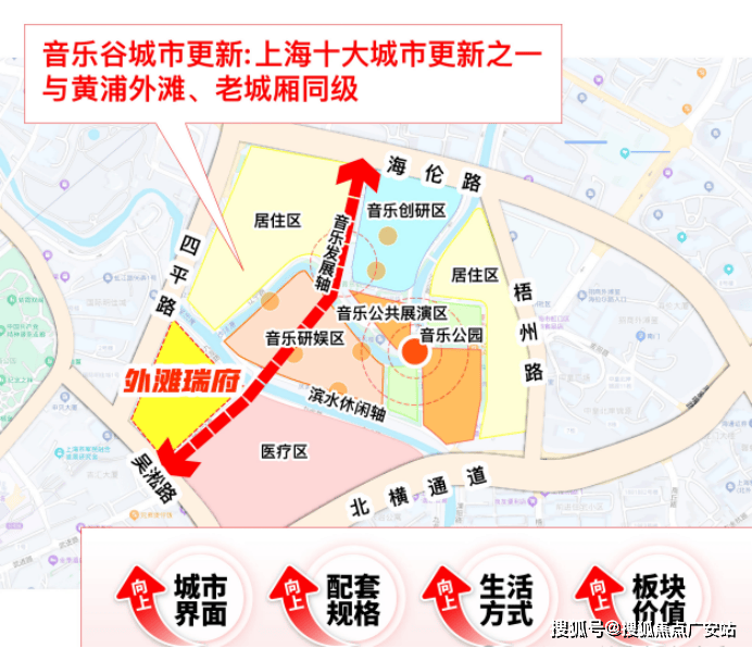 项目紧挨嘉兴01单元,正对上海音乐谷,未来将形成滨水艺术休闲区,规划新增8个小剧场、3个livehouse、1个水上剧场,把“夜上海”的流量重新拉回虹口。从外滩瑞府出发,穿过一座步行桥,就能抵达这个未来的世界级演艺群落。