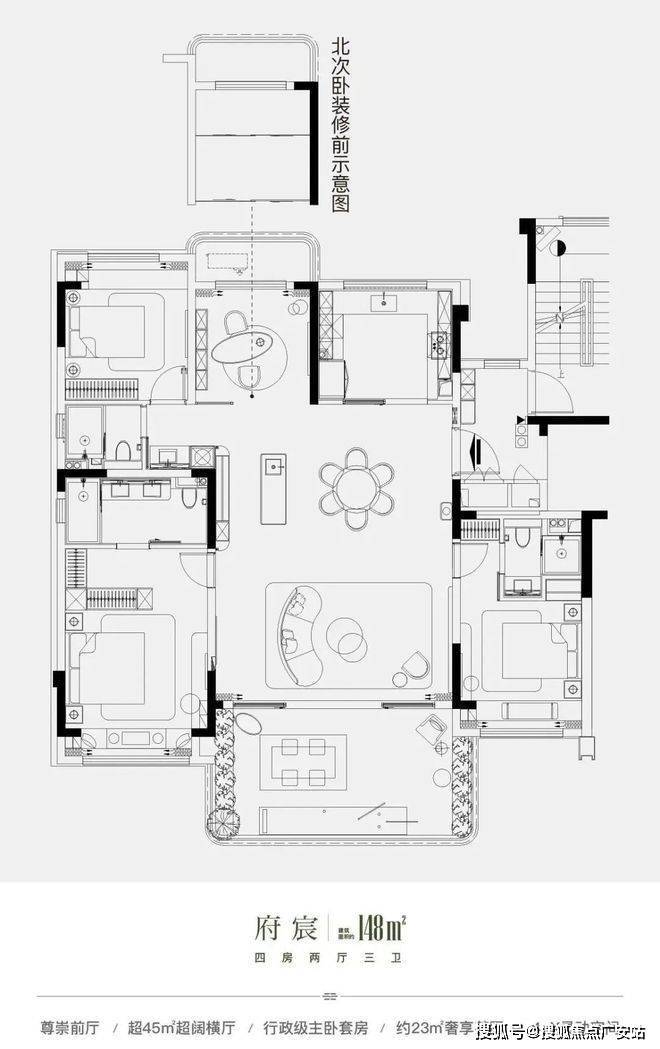 创新性设计包括户户15-23㎡空中花园、独立电梯厅及双套房布局(148㎡户型)