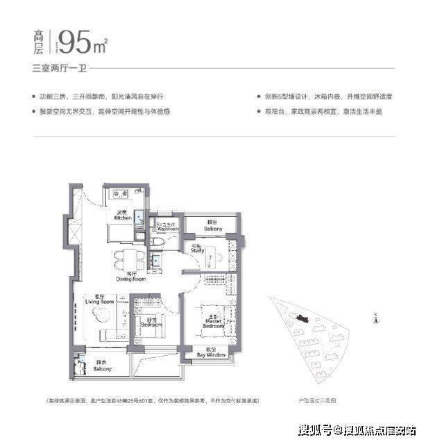 建面约95㎡高层,全系方正户型,双阳台设计,LDKB一体化设计,贯通动区轴线,打造温馨的家庭生活聚餐;
