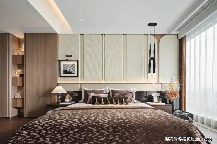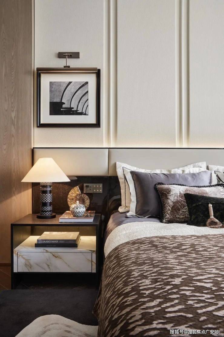 次卧以现代简约手法营造静谧场域,金属材质与丝质肌理面料,胡桃木格栅与亚麻织物围合疗愈空间,既作长辈临时居所,亦可作为夜归男主人的缓冲驿站。记忆相框墙收藏家庭温情时刻,在简净中诉说岁月故事。