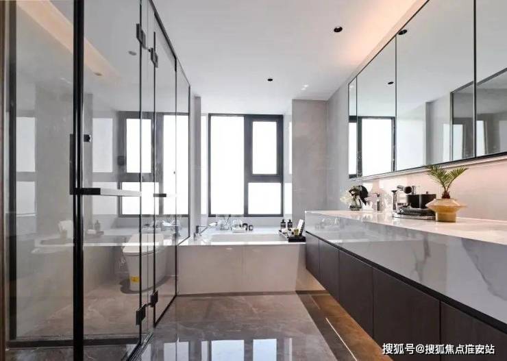 朝南大尺度飘窗带来全明采光,L型超大衣帽空间,女主人的衣服、包包都可妥善归置。值得一提的是,主卫不仅配备了双台盆,并且还做到了四分离设计,洗漱、淋浴、马桶、浴缸都在不同的空间,真正做到了私密而舒适。