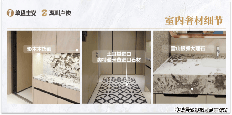 项目不惜成本,严选十余种珍贵奢石与臻质材料,外立面、门庭、公区、车库、室内等多重空间,皆以奢材精心雕琢。