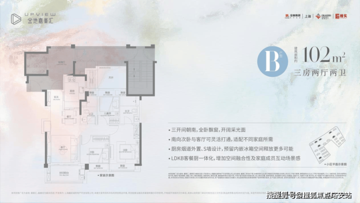 A户型是建面约102㎡3房2厅2卫,该户型三开间朝南,采光效果上佳。 大方厅设计,空间开阔自由度更高。南向次卧和客厅可灵活打通,适配不同家庭所需;大进深阳台+全景落地窗,让室内的通透性和视野可圈可点。