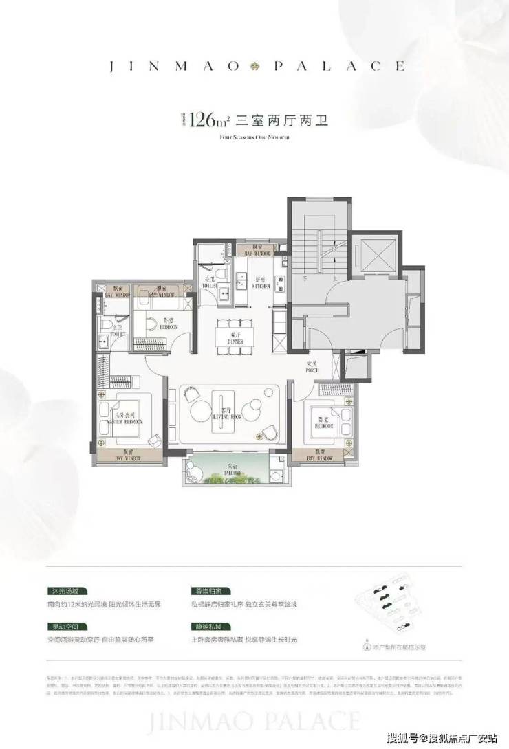 户型方面,约114平的3房2卫2厅户型,南北通透+三开间朝南+双阳台,三个房间开间都很宽,相比百平米三房更注重舒适感。