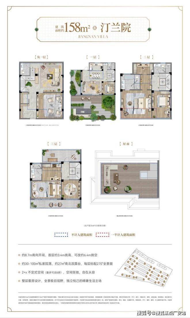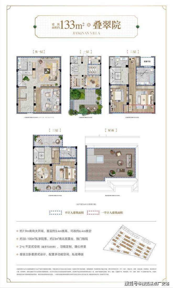 联排别墅:面积133-158㎡,共25栋3层建筑,首层挑空3.4米,二、三层层高3米,总价268万起,得房率超245%1