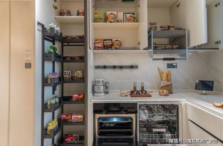 创新厨房飘窗多功能大单槽,不浪费厨房飘窗赠送面积,合理布置料理动线。满配橱柜收纳五金件、轻松抽、天使拉篮、调味拉篮、太空舱。还配置了零食柜。