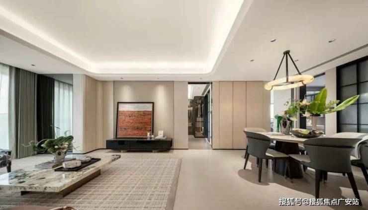 选用岩板+影木木饰面+客厅皮革面背景墙+壁布等名贵材料组合,整体设计雅致而不落俗套,彰显主人的居家质感与生活品味。