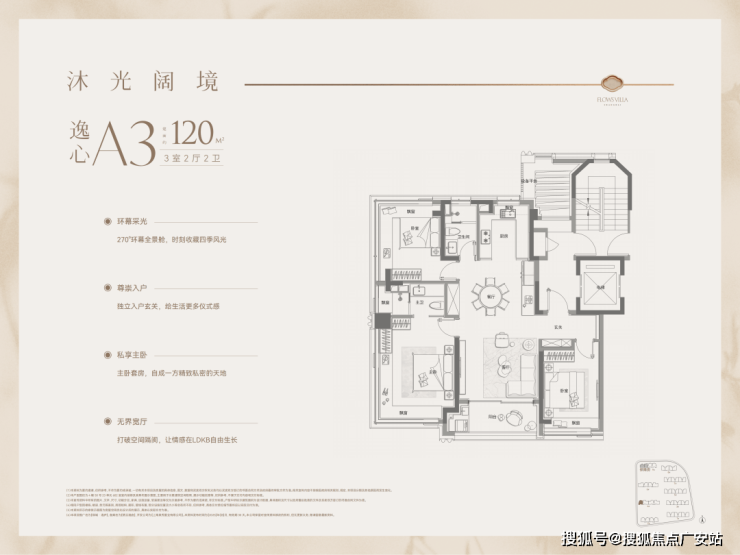 另外还有约120㎡的3房户型,全屋飘窗赠送(实得率超82%)+类一梯一户(4#、6#楼配置)+270°双卧转角窗(边套户型)+飞机户型南北通透+约10.8-11.2米大面宽三开间朝南,尺度感拉满,而且设备平台精心设计,不遮挡北侧视线。