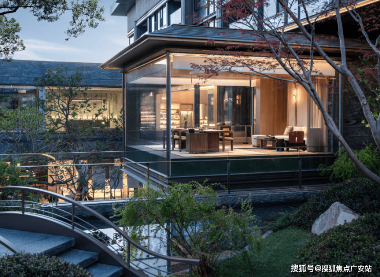 再往里走就是近460㎡的下沉式庭院,精选太行山金景石堆叠成小山丘,引进溪水汇聚成池塘,并移栽岭南珍贵的古桩铁冬青和中华原生乌桕树,形成一幅立体山水画卷。