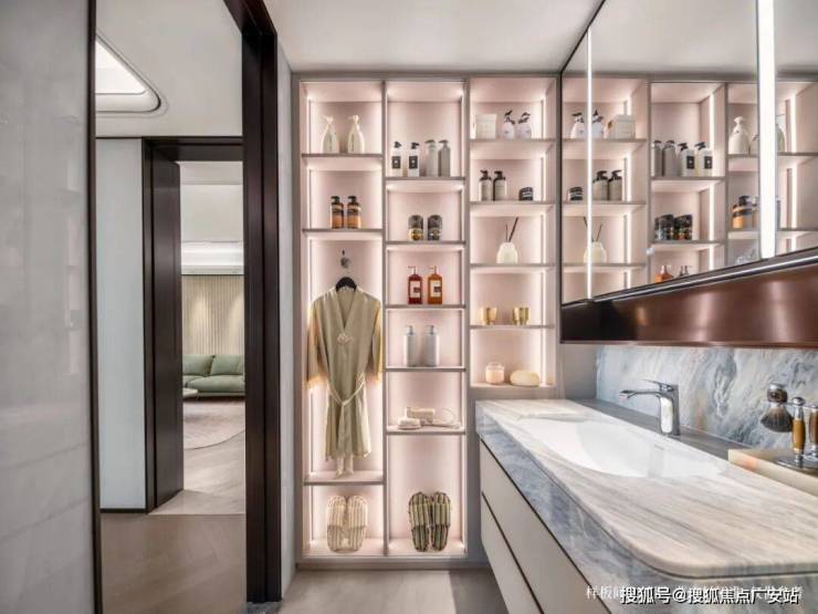 主卫镜柜收纳空间,满满的一面墙,还贴心配置了一个可调节温度的美妆冰箱,女主人看到了很难不心动!