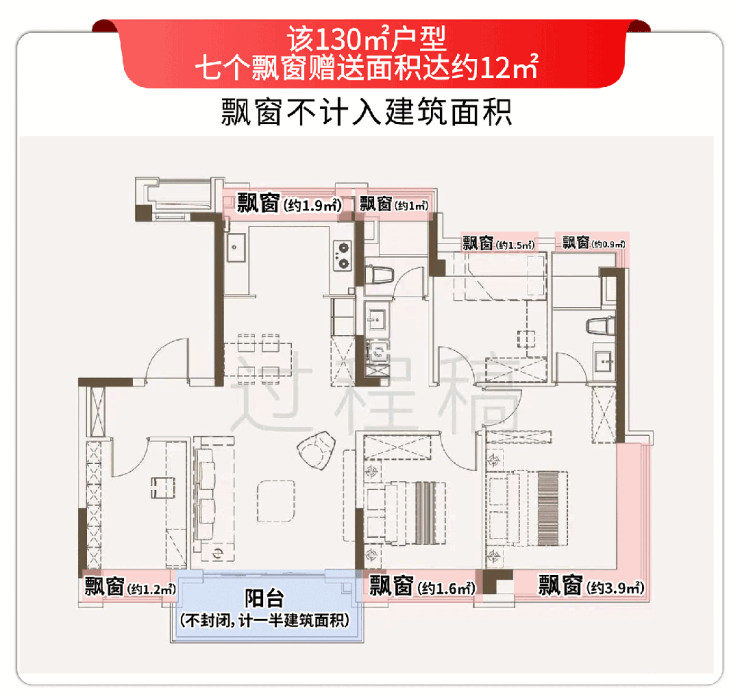 七个飘窗赠送面积达约12平,比常规次卧都大。