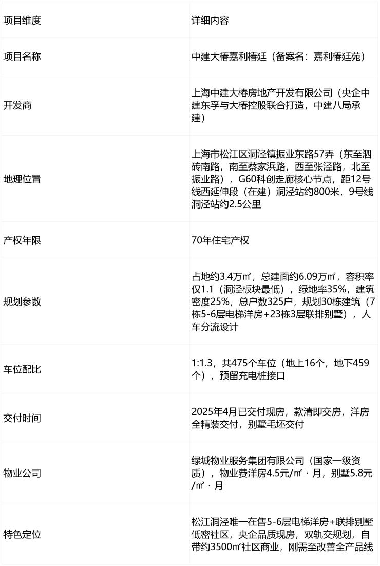 中建大椿嘉利椿廷作为松江洞泾1.1超低容积率墅质社区+央企中建精工+12号线地铁旁+华二名校加持+实景现房+精装三大件+3500㎡自带商业的稀缺组合,精准击中刚需至改善家庭"低密舒适+高效通勤+名校教育+央企品质+所见即所得"五大核心诉求,核心优势归纳为七大维度,完美融合央企保障+低密生态+地铁红利+全龄教育+实景现房,是上海西南400万级低密洋房市场的"稀缺孤品"。