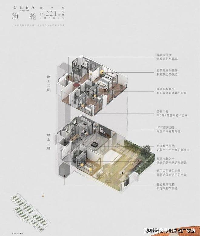 中间套下叠“旗枪”户型为例,利用地势高差做了下沉式庭院,由于是坡地地形,所以即便是地下空间,也有大面采光;二楼则设计了挑出露台,拥有大面积室外空间。