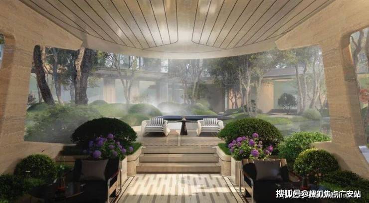 “回归之境”以3500㎡下沉水苑为核心,汇聚会客、泳池、茶室等多功能空间,形成仪式感十足的社区舞台.