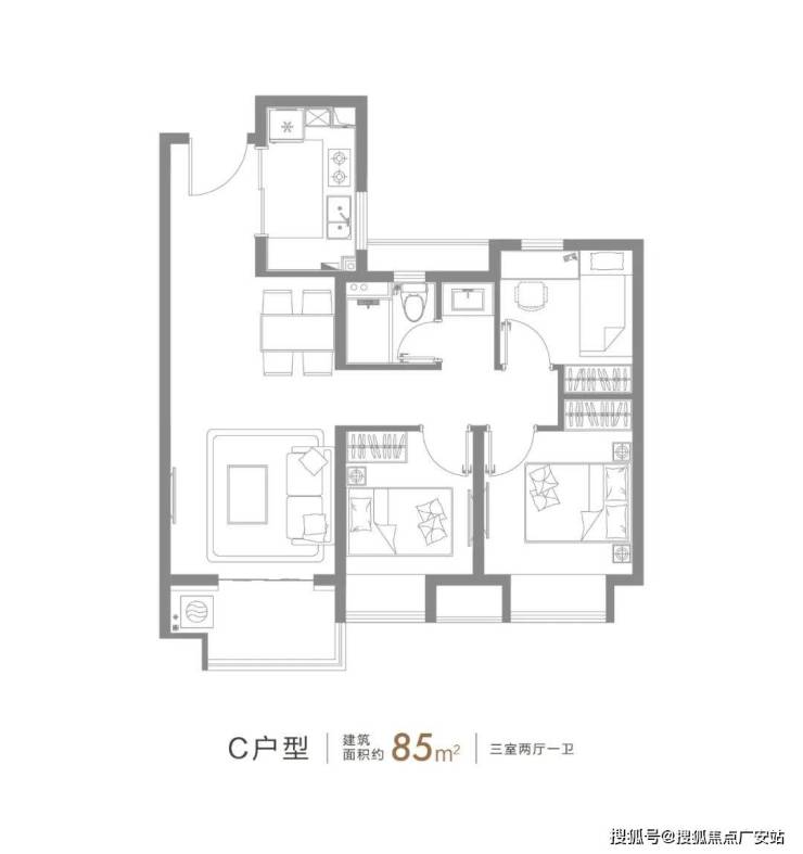 约85㎡的3房2厅1卫,三开间朝南+整体动静分离的设计,都保证了这个户型的居住舒适度。