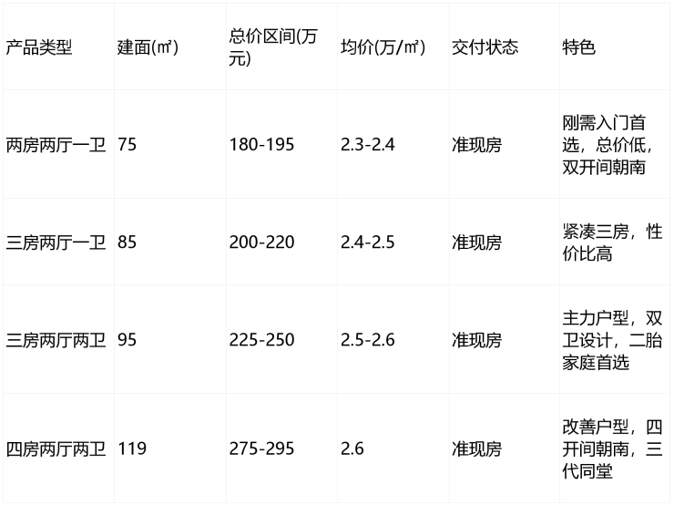 总价区间:75㎡约180-195万,85㎡约200-220万,95㎡约225-250万,119㎡约275-295万