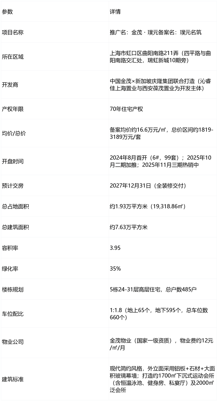 核心定位:金茂上海首作TOP级璞系科技豪宅,虹口内环内瑞虹新城核心区,"外滩-北外滩-陆家嘴"黄金三角北支点,主打建面约128-239㎡精装科技住宅,均价约16.6万元/㎡,总价约1819-3189万元,适配高端改善家庭与商务精英