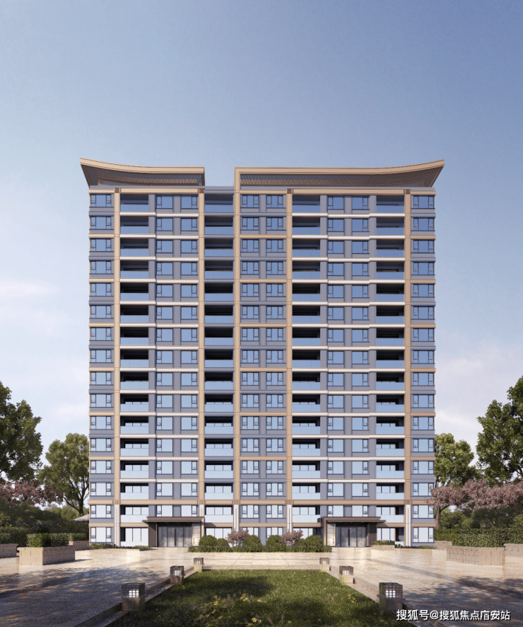 项目外立面承袭新中式府系基因,以浅灰色铝板、双层中空Low-E玻璃为主材,搭配青云纹线条与古铜色金属格栅,勾勒挺拔雅致的天际轮廓。The building facade inherits the new Chinese-style mansion gene, using light gray aluminum panels and double-layer insulating Low-E glass as main materials, matched with azure cloud-patterned lines and bronze metal grilles, outlining a tall and elegant skyline contour.