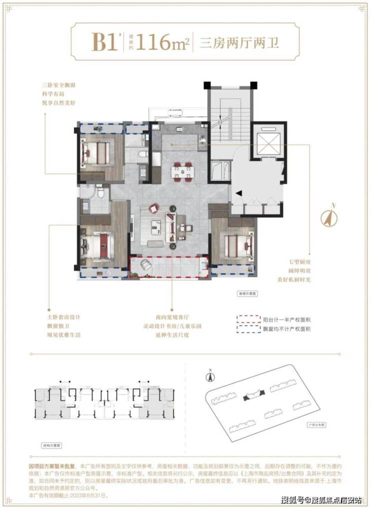 116m²户型特点:三卧室全飘窗,科学布局,悦享自然美好,南向宽境客厅,灵动设计书房/儿童乐园,延伸生活尺度,U型厨房,阔绰明亮,美好私厨时光,主卧套房设计,飘窗独卫,境见优雅生活。