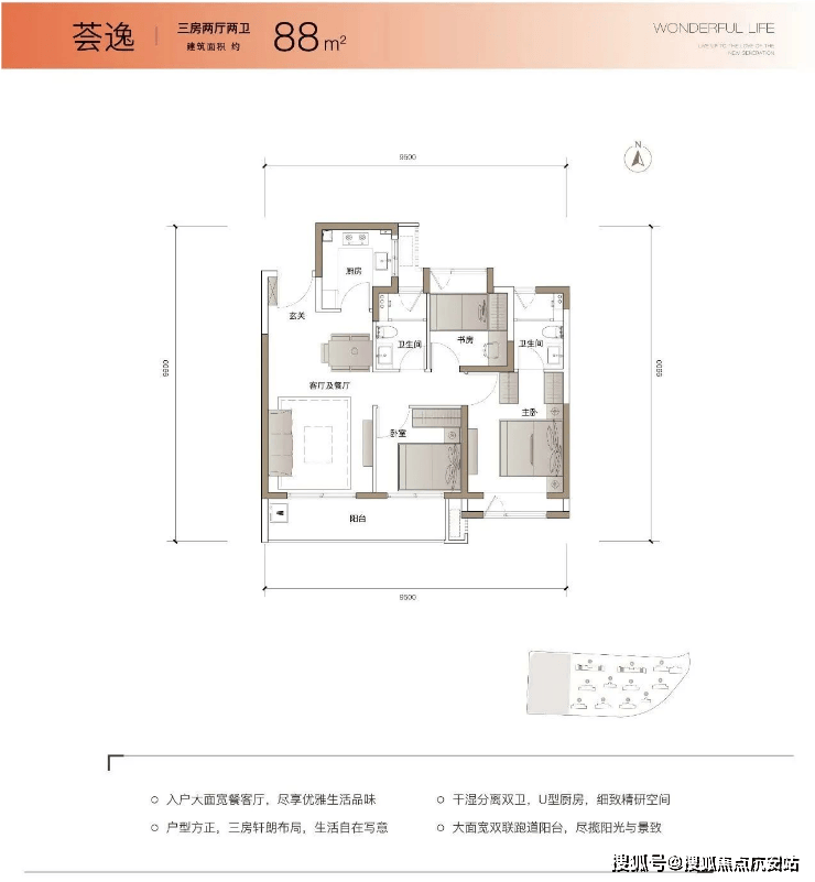 户型产品:主力户型为建面约88–89㎡三房两厅两卫,总价约249万起,定位刚需及刚改客群。