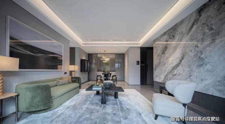 同时,电视背景墙也是一整块西西里翡翠岩板,还有申请了国家专利的东方云纹岩板,建面约238㎡更是整块玉石(原石材),全苏州仅此一家!