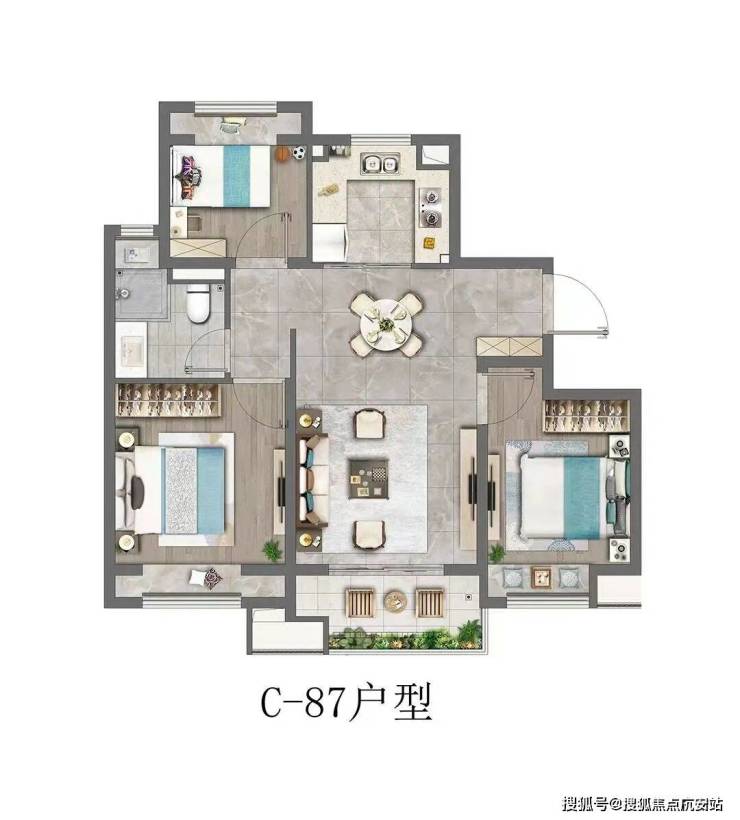 建筑面积约87㎡三房户型,可谓云湖壹号的“头牌明星”。三开间朝南,南北通透,所有卧室均带飘窗,不管是采光、通风、还是视野,这个户型都无懈可击。