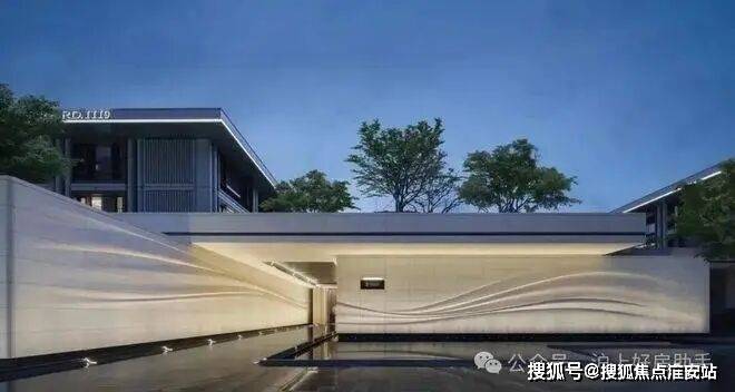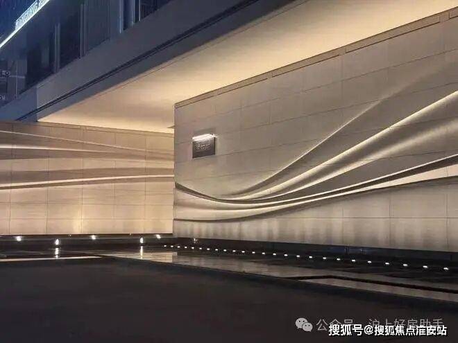 采用米黄色温润石材,巧妙模拟风的流畅形态,营造出既庄重又舒适的归家氛围。这片宽广的流线型石墙在柔和灯光的映衬下,更显璀璨夺目,而风雨连廊的灯带设计,更添一份尊贵仪式感。