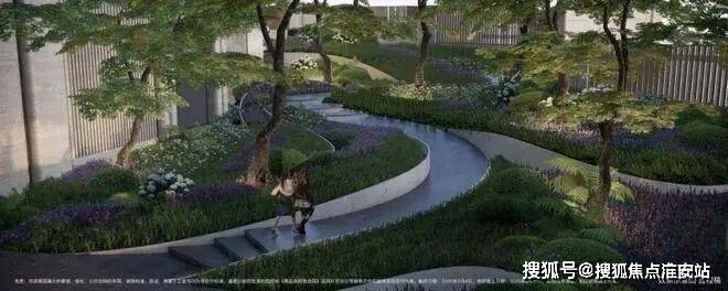 通过景观设计,将小区景打造成了立体台地花园,设置缓坡、下沉式花园、台阶等,让整体景观表现出立体层次感,错落有致。