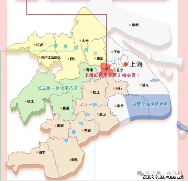“两带”是以虹桥商务区为起点延伸的北向拓展带和南向拓展带。其中,北向拓展带重点打造中央商务协作区、国际贸易协同发展区、综合交通枢纽功能拓展区。