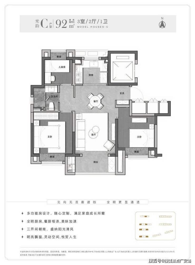 另外这个户型能更好实现南北通透,客厅-餐厅-阳台-厨房一线连通。