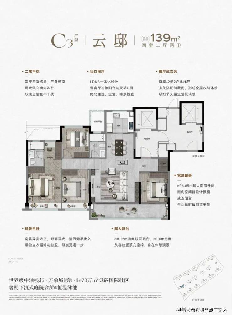 139㎡四房:四开间朝南、约 12 米横厅,主卧套房 + 独立衣帽间,改善主力。
