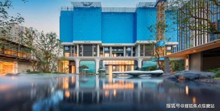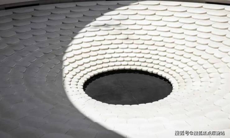 浮光池院水院会客厅,现已实景呈现,水景中央的艺术小品,如一滴水在湖面晕开,泛起阵阵涟漪。
