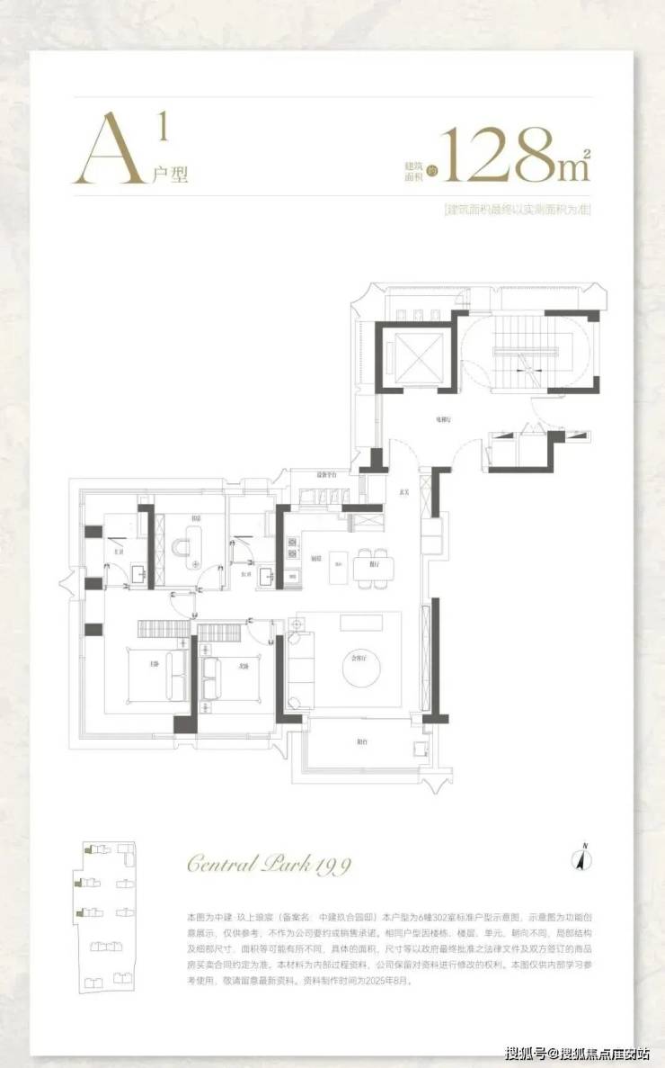 约128㎡A户型,动静分离格局,功能区与休息区互不干扰,超大南向面宽+270°采光面,客厅开间达到了约5.4米,景观视野突出。