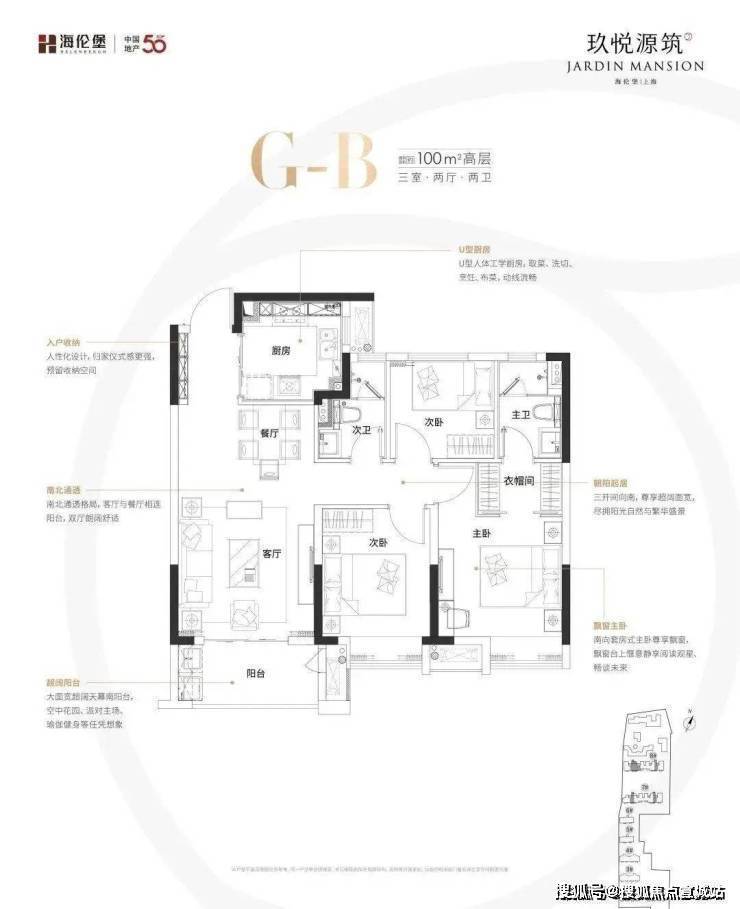 建面约100㎡的3房2卫户型,三开间朝南,主卧套房设计,几乎做到了市面上3房2卫户型能做到的所有优势。