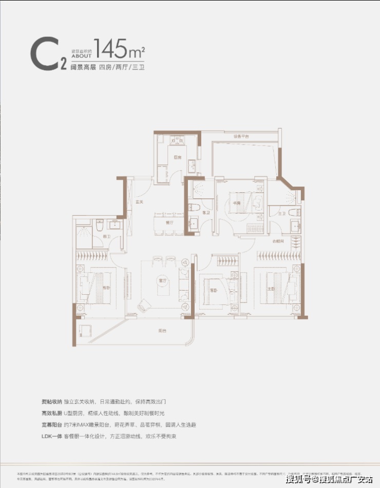 户型亮点:120㎡三房实现三开间朝南(面宽约10米),U型厨房设计,弧形阳台放大景观视野;联排别墅197㎡配备四卫浴设计+内外双庭院,主卧套房占据一层,得房率高达92%。