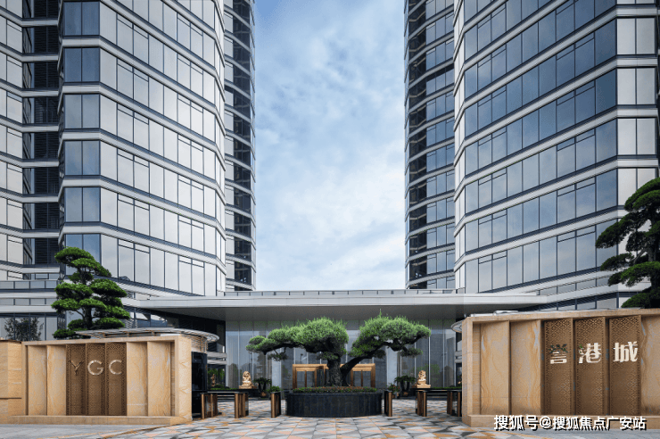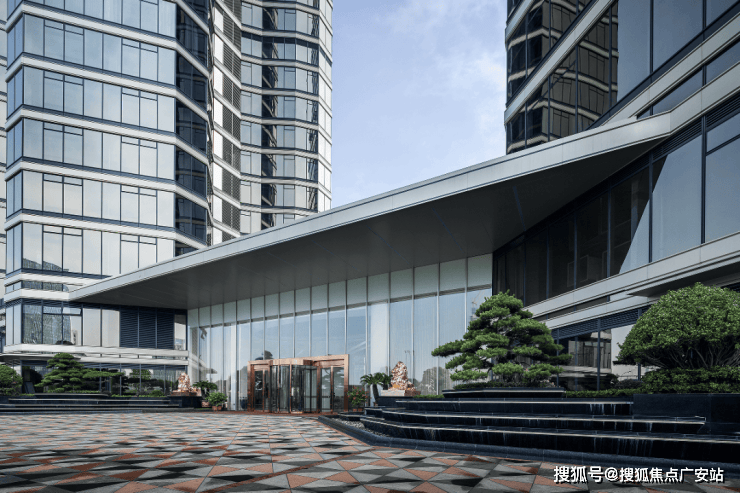 外立面:现代流线型设计,大面积玻璃幕墙+鎏金铝板组合,如桂花绽放