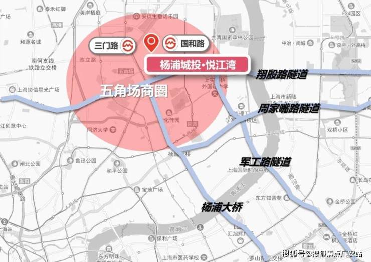从项目地出发 距离约1公里即可到达中环国和路上匝道口,直达市中心。翔殷路隧道,军工路隧道和周家嘴路隧道,是北上海连接浦东浦西的重要通路,也是五角场作为北上海“地区中心”,源源不断吸引来自宝山、嘉定、浦东北部区域人员财源的重要保障。