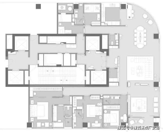 胤璞“荣耀”700方:户型由GFD广飞设计事务所创始人叶飞亲力打造。五间豪华套房与三大公共空间的布局,能够满足每一位家庭成员的个性化需求。双重入户动线与私属门厅玄关,尽显归家的尊崇礼序。