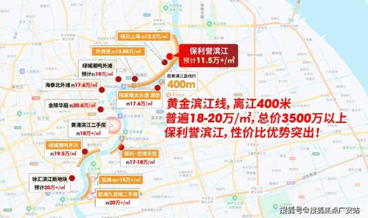直线距离黄浦江约400米的新房本就寥寥无几,而这片区域的新房均价普遍达到18-20万/㎡、总价3500万起;而保利誉滨江不仅能跻身400米临江的稀缺阵营,更是这条线上卖一个少一个的“11字头”新房,总价更显温和,性价比优势突出。