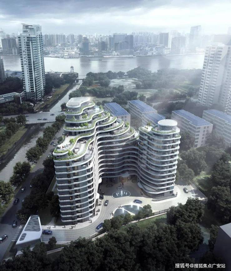 大楼外立面采用前瞻性的退台式波浪线型设计,巧妙地将江景与建筑相融合,