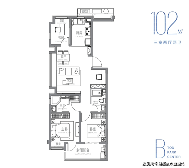 当然, 建面约102㎡3房和建面约 104㎡3房也是可圈可点, 二者都间兼具私密性和舒适性,100平出头的空间营造的空间感和尺度感远超更高价位新房!