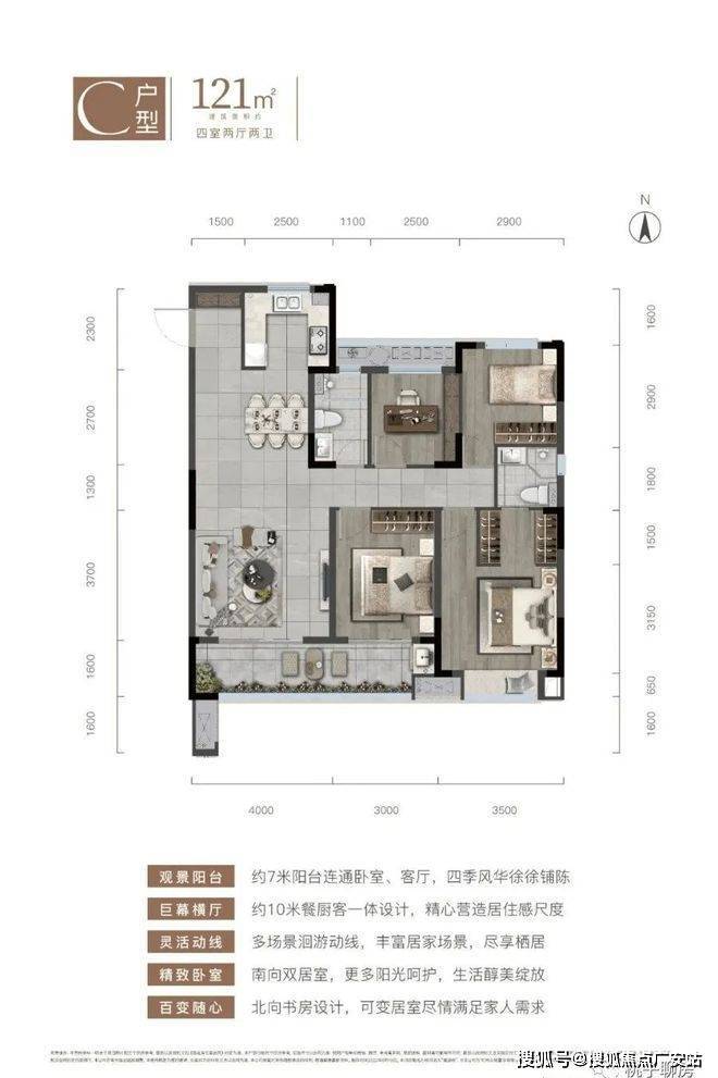 在售户型:89㎡(三房)、105㎡(三房)、108㎡(三房)、121㎡(四房)