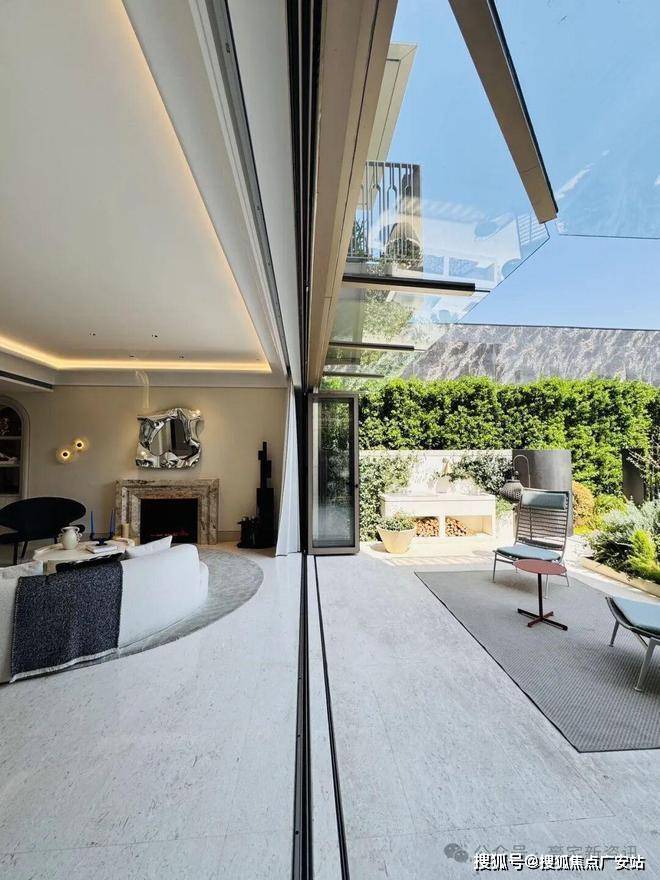 「无界空间」:客厅270度转角无柱设计,搭配落地玻璃,开阔视野将院中风景迎入日常。