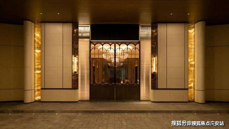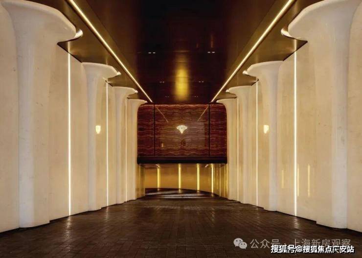 6、 社区含“奢材”量很高。门庭延街的外立面,以精工定制弧形 米色石材为主调,镶嵌典藏级 老虎玉大理石,点缀 古铜色现代海派艺术感灯器,整体呈现出百年海派的贵雅气质。